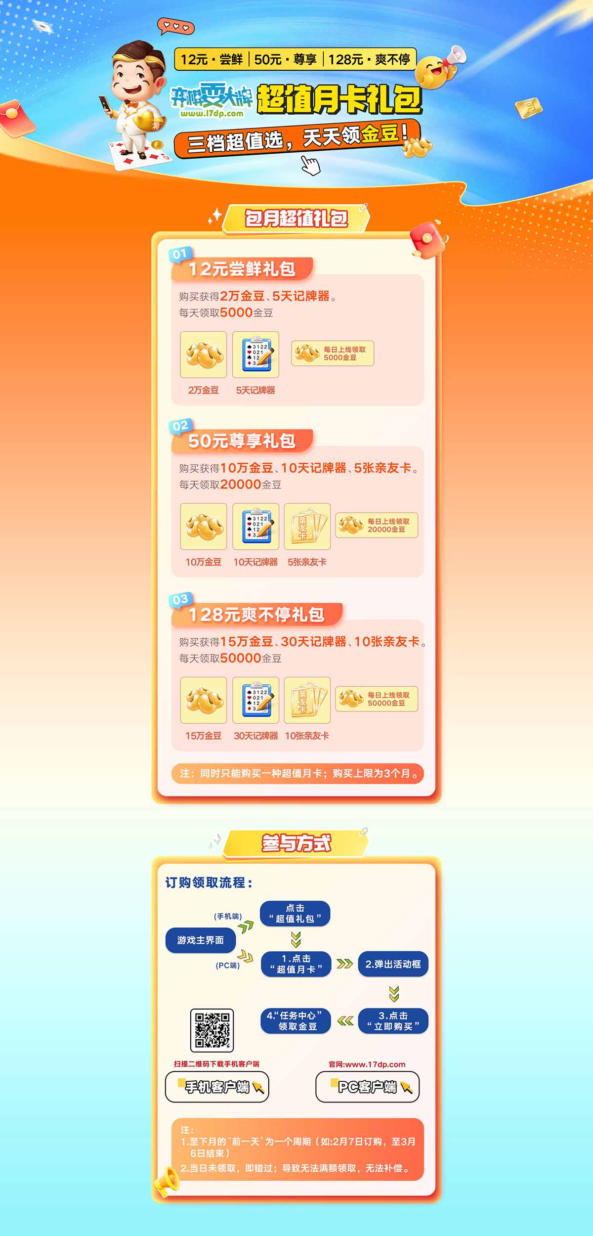 超值月卡礼包,三档超值选,天天领金豆!