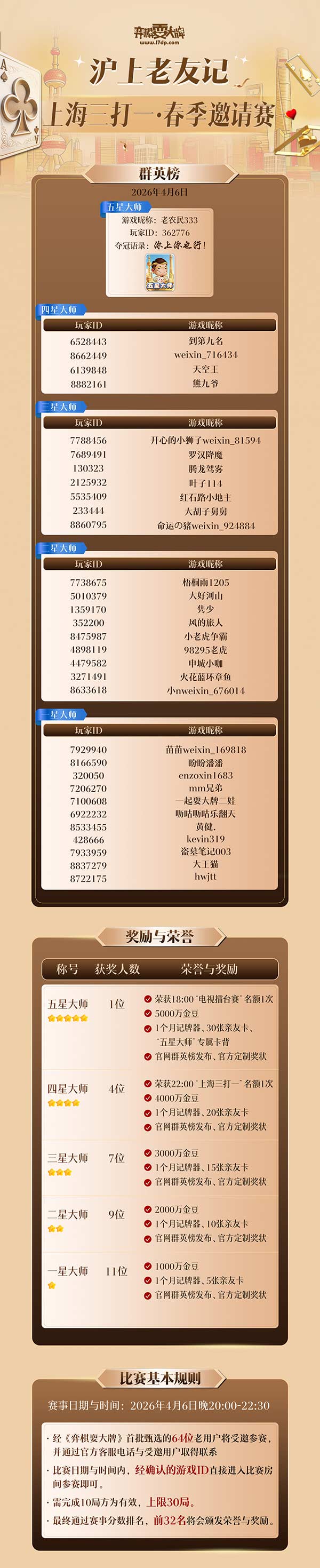 沪上老友记 | 上海三打一 · 春季邀请赛群英榜